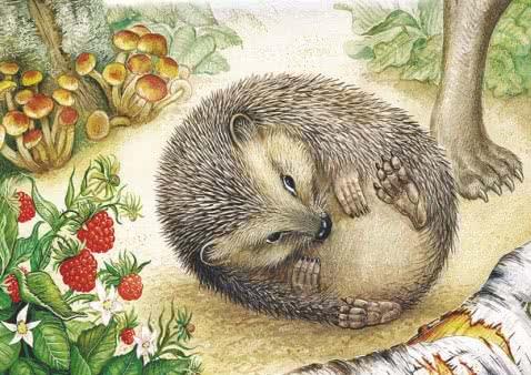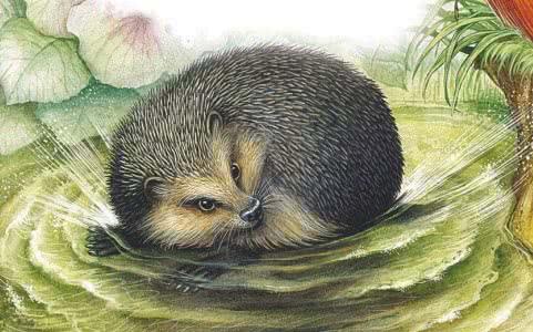 И только было покатился по дорожке,- Лиса его тихонечко, одними коготками толк в канаву! Колобок — плюх!- в воду. Мигом развернулся, заработал лапками,- поплыл. Тут все и увидели, что это совсем не Колобок, а настоящий лесной еж.