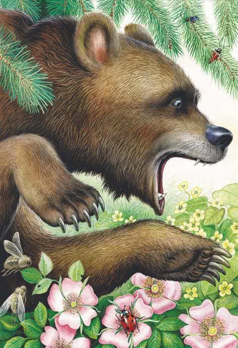 Медведь разозлился, хотел его в пасть схватить, губы наколол,- ой, больно! А Колобок опять покатился,-только Медведь его и видел!