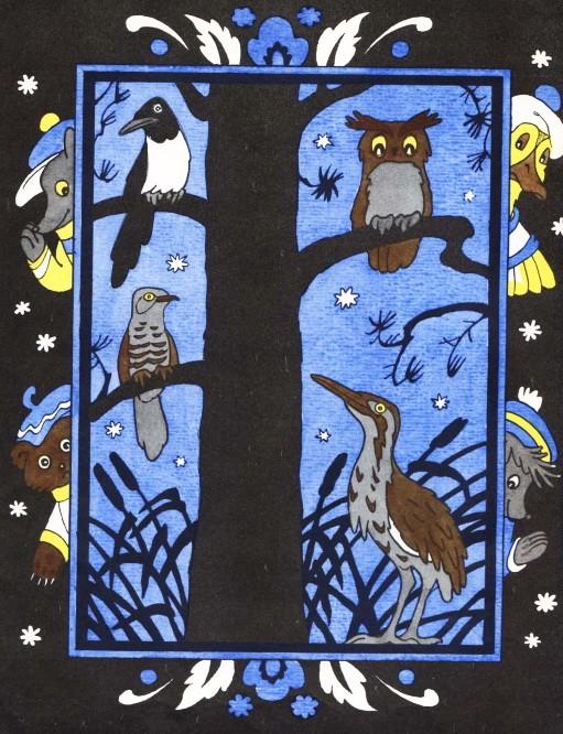 Кукушка, Сорока и Филин на высокой сосне сидят, Болотный Бык — в речных камышах, поблизости. И молчат, держат слово крепко.