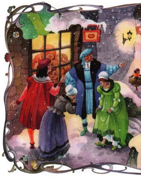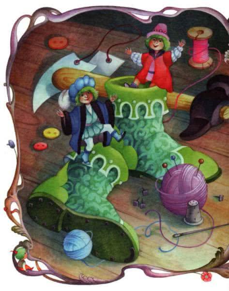 Ровно в полночь, как всегда, пришли в комнату маленькие человечки. Они прыгнули на стол и хотели сразу же приняться за работу. Только смотрят — на столе вместо скроенной кожи лежат красные рубашечки, костюмчики и стоят маленькие сапожки.