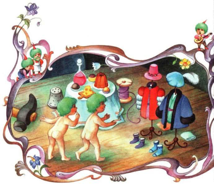 — Маленькие человечки сделали нас богатыми. Надо и нам сделать для них что-нибудь хорошее. Приходят человечки к нам по ночам, одежды на них нет, и, наверно, им очень холодно. Знаешь, что я придумала: сошью-ка я каждому из них курточку, рубашечку и штанишки. А ты им сапожки смастери.